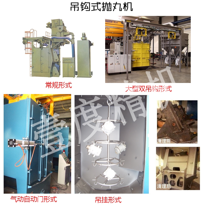 注:本機適用鋼砂、鋼丸或鋅丸等金屬磨料,拋丸器可變頻調速,吊具可設計成固定在機艙內,也可以設計成自動進出形式,工件自轉速度可變頻調整,門可自動開啟也可以做成手動開啟,裝卸工件處可加裝安全光幕,讓操作更安全可靠,也可根據需要定制其它輔助使用裝置。以上機型為我公司標準化設計,如果客戶需要其他形式,可根據客戶工件大小及工藝需求規劃設計,隨時歡迎來電咨詢,我們將竭誠為您服務。